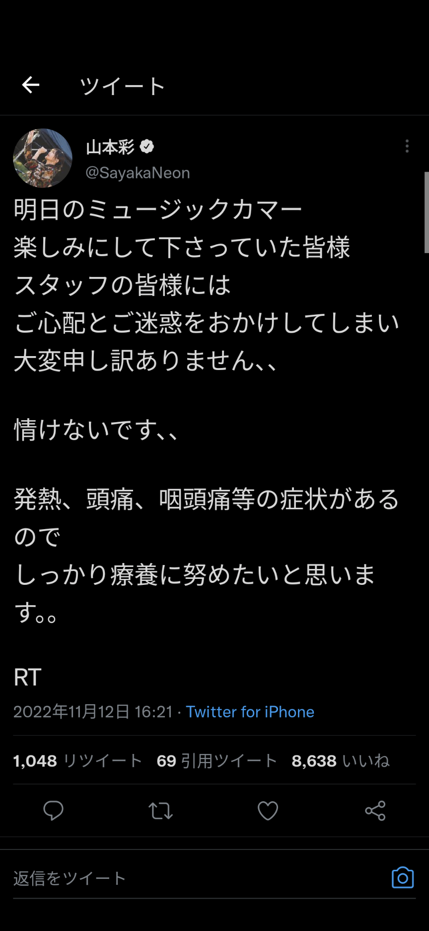 山本彩は11月12日(土)に発熱し、PCR検査を受けた結果、陽性と診断されました。今後、保健所の指示に従って療養します。