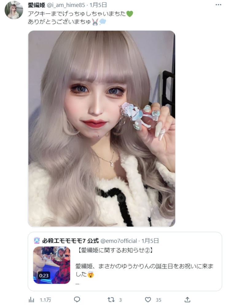 なお、必殺エモモモモ7の公式ツイッターは5日、グループを解雇されたばかりの愛編さんが、メンバーのゆうかりんの誕生日を祝いに来たと報告。「まさかのゆうかりんの誕生日をお祝いに来ました」「只今、本人楽しそうにしています」「GALには勝てません...」と呆れたように伝えていた。